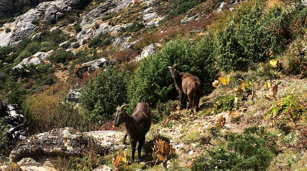 Always be on the cliffside while you share the trail with blue sheep, yaks, and dzo (a crossbreed of yak and cow).